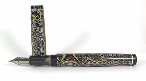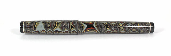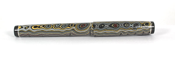 This Homerton fountain pen is made from Fordite with Black Pearl Kirinite for the lining, threads and section.