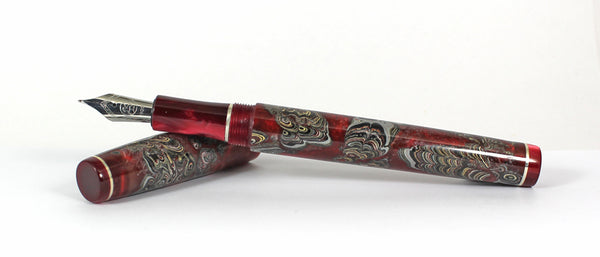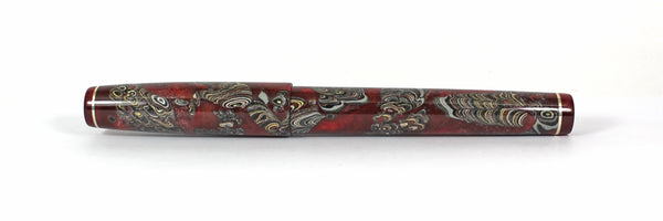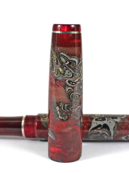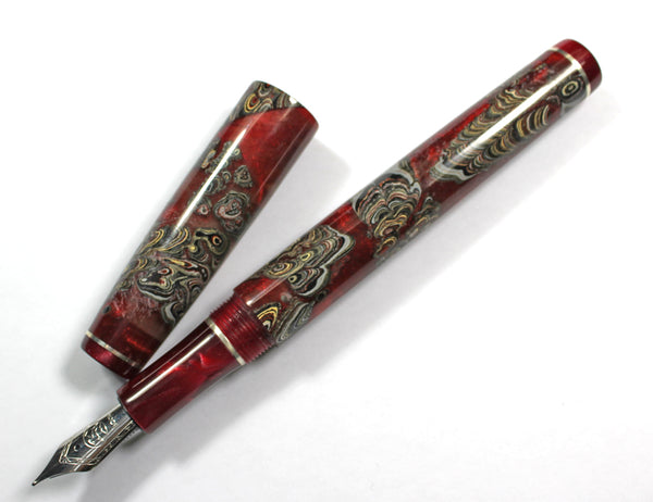 This Homerton fountain pen is made from Fordite, Rioja Pearl Kirinite for the lining, threads and section.