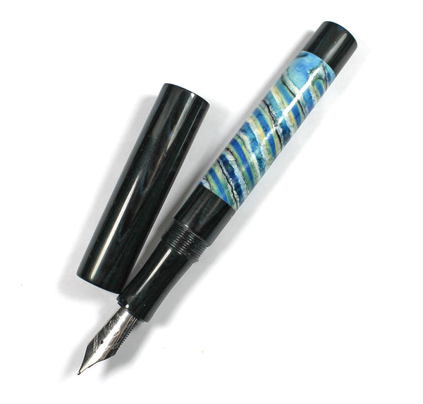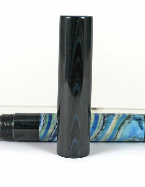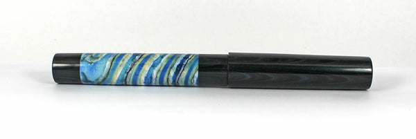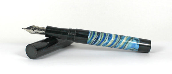 This Grand Homerton fountain pen is made from Woolly Mammoth Molar / Tooth & Nikko Blue & Black Rippled Ebonite for the lining, threads and section.